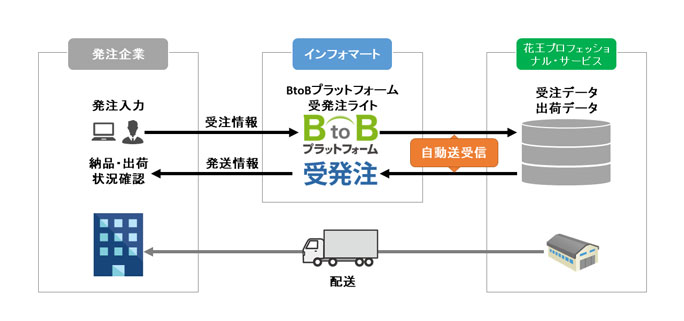 統括部長:2017年に中小企業庁の委託を受けて、業務品の卸・小売業界における共通EDI連携の実証実験を行いました。合言葉は“どこからの受注も、どこへの発注も、ひとつの仕組みで繋げる”です。インターネットを通して受注するシステム『BtoBプラットフォーム 受発注』を利用し、飲食店や卸、弊社以外のメーカーともシームレスにつながる基盤づくりの促進をはかるというものです