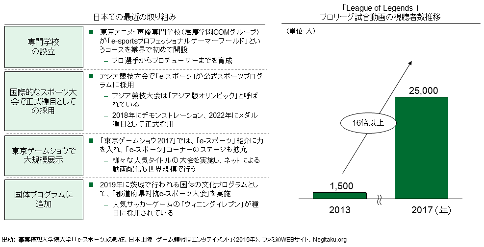 そんな中、スマートフォン・タブレット端末の普及によってゲーム実況動画を視聴する人が増加するとともに、日本人プロゲーマーが誕生しe-スポーツの認知度が向上、日本でもe-スポーツが注目され始めています。