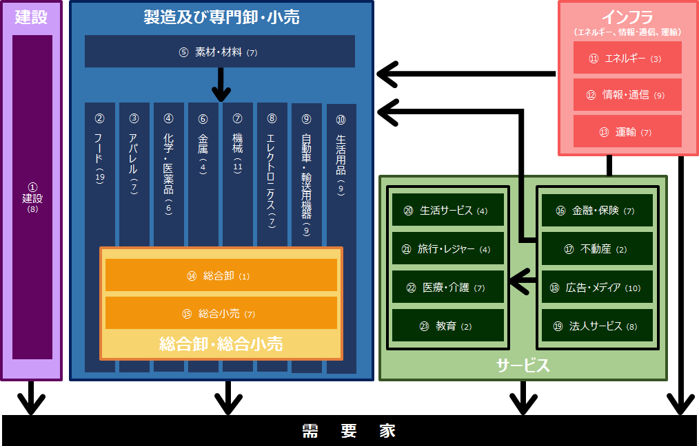 業界チャネルの"業界"は、総務省告示の日本標準産業分類をもとに、業界を横串で見て発見・気づきが得られるよう製品・サービスカテゴリ × プロセスで分類して、下図のように「建築」「製造及び専門卸・小売」「インフラ」「総合卸・総合小売」「サービス」という5つの大分類と23の中分類に定義を行っています。中分類をさらに158の小分類で分け中分類・小分類の単位で業界分析を行っているものが業界レポートです。