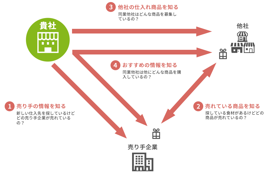 希望する食材や取引先の情報を登録することで、一致した食材・取引先を自動でマッチングし、今よりも安い食材やこだわり食材などがすぐに見つかります。
