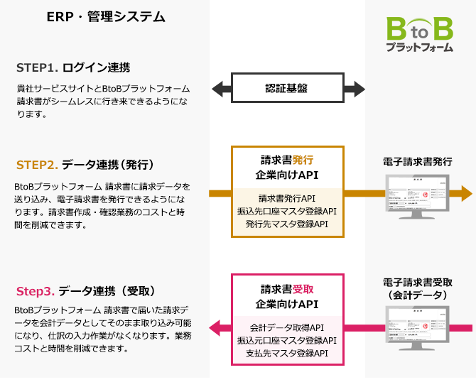弊社では、多くのERPや会計・販売管理システムとのシステム連携を強化するため「BtoBプラットフォーム」の仕様に係るデータ構造を外部連携APIにて公開しております。