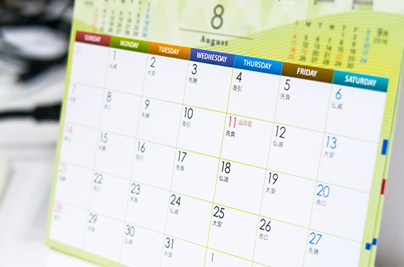 土曜日、日曜日、祝日が休日です。その他、年間を通して好きな時期に数日休みが取得できる特別休暇や、年末年始休暇等が長期休暇として定められています。